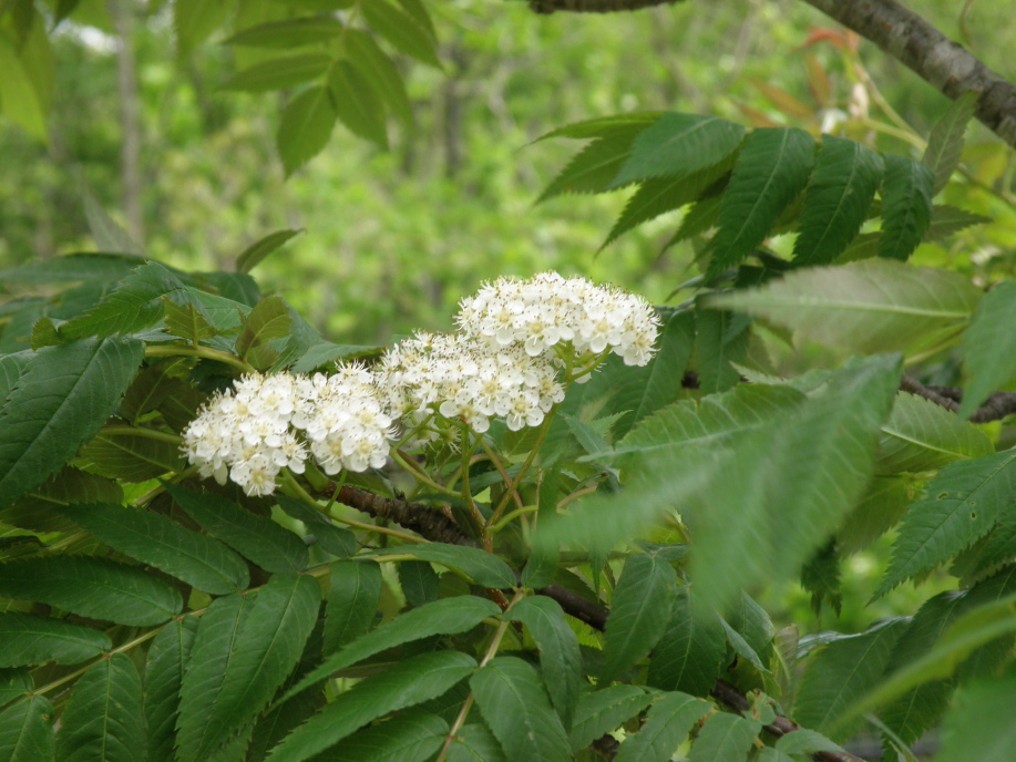 古関パーキングのナナカマド(七竈;バラ科) の白い花です。ナナカマドの木は非常に堅く七回カマドで燃やしても燃やしきれないということで、この名が付いたという。秋になると真っ赤な実をたわわに付け、自分自身も見事に紅葉しますが、この時期は控えめな佇まいです。