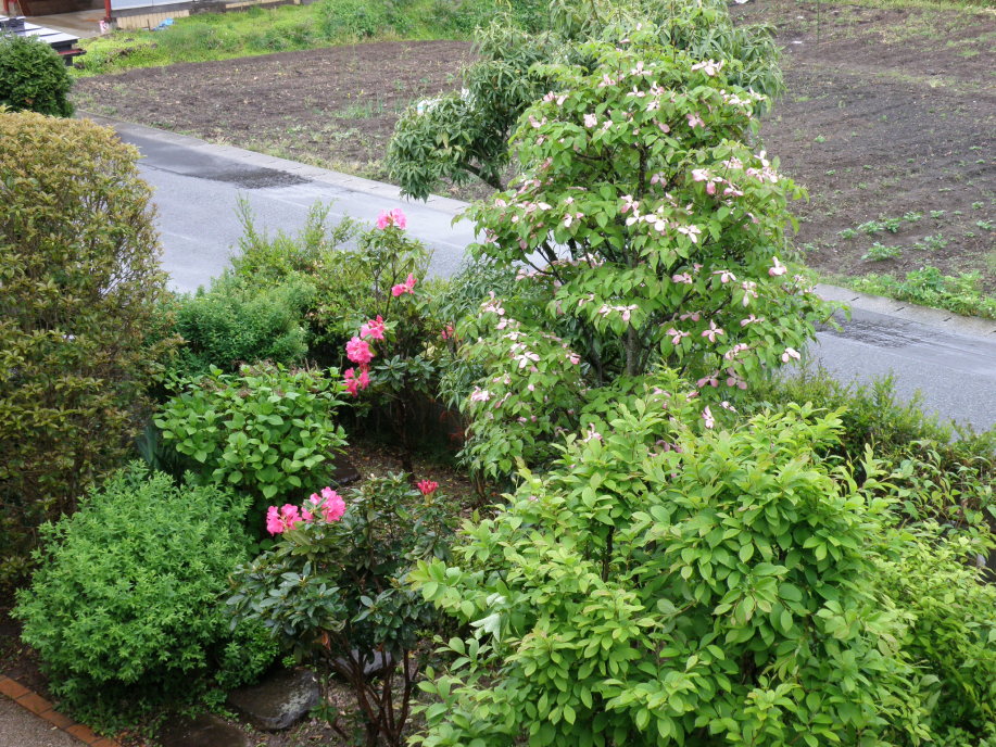翌日は雨模様でした。東根の実家の庭先です。二階から写真を撮りました。ちょうどシャクナゲの花が満開で、隣のハナミズキにも紅花がまだ咲いていました。周りの緑とよく調和しています。