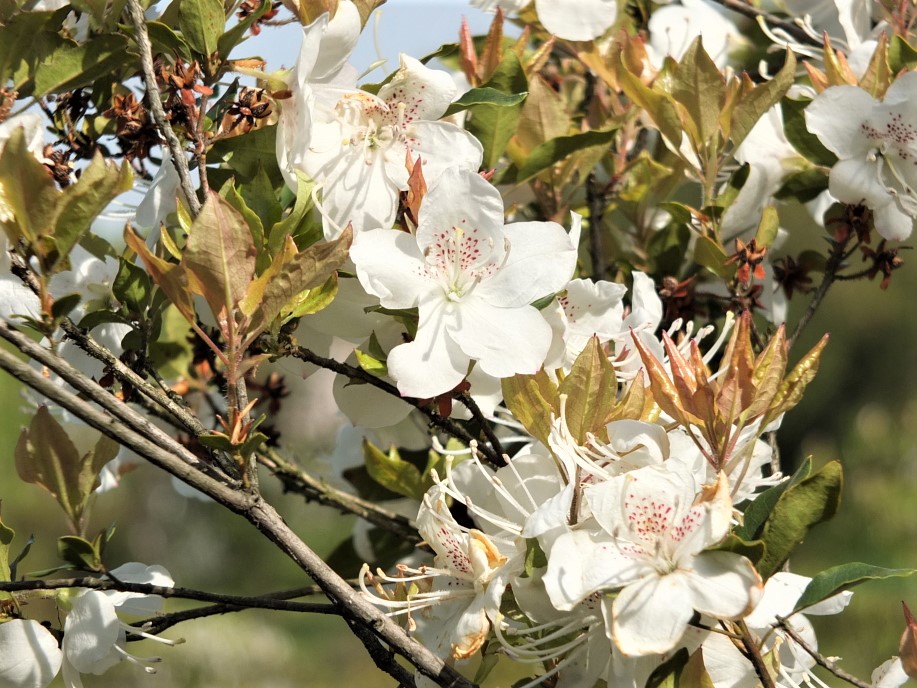 ツツジの仲間のシャクナゲ(石楠花)の花も咲き出してきました。柴田記念館の近くのシャクナゲの高木が見事に満開になっていました。シャクナゲはツツジ属ではありますが、その中で無鱗片シャクナゲ亜属シャクナゲ列の植物がいわゆるシャクナゲといわれます。高山性の常緑低木のシャクナゲは、ツツジと異なり細長く堅めのしっかりとした葉が特徴です。日本全土の亜高山帯や周辺の渓谷に自生し、花は赤紫から白まで変化に富んでいて、いずれも高貴な風情があります。