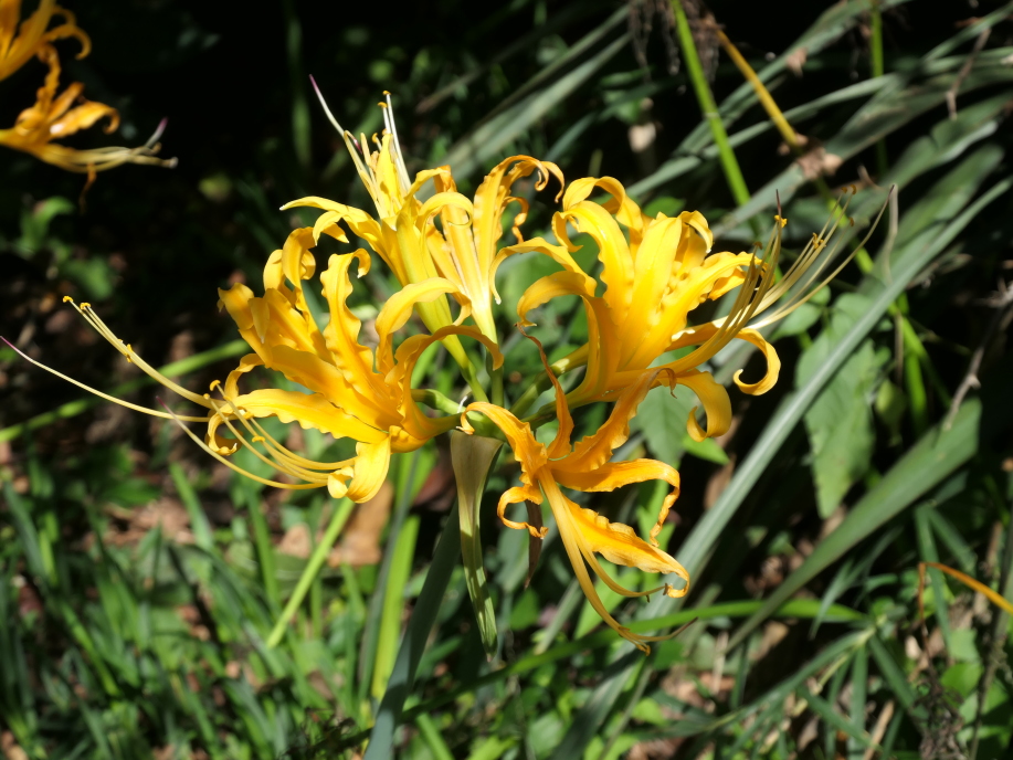 ヒガンバナの群生地に立ち寄ってみたら、姿形がそっくりですが、花が橙色のショウキズイセン(鍾馗水仙;ヒガンバナ科ヒガンバナ属)が盛んに咲いていました。中国からの帰化植物で九州、四国、沖縄などで自生する球根植物。形状から黄花彼岸花とも言われる。ヒガンバナに遅れてこの時期に咲き出します。