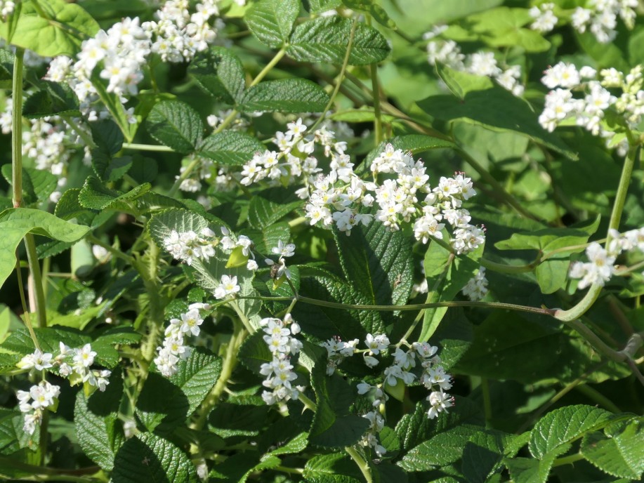 チベットの高地に自生する多年草のシュッコンソバ(宿根蕎麦;タデ科ソバ属)が、園内の草むらに盛んに咲いています。シュッコンソバの白い花は普通のソバの花と似ていて、清楚な趣があります。地下に黄赤色の根茎を残し越冬します。