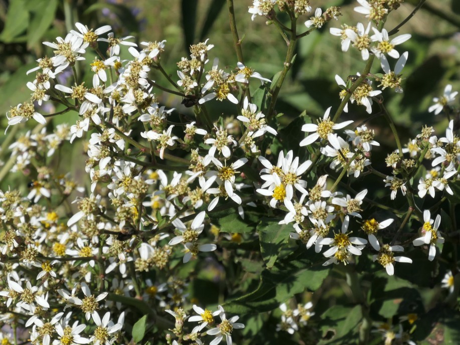秋の野の花も見かけました。これはシラヤマギク(白山菊、婿菜;キク科シオン属)です。秋の山地に咲く野菊の一つで、北海道から九州、朝鮮・中国に分布する多年草。