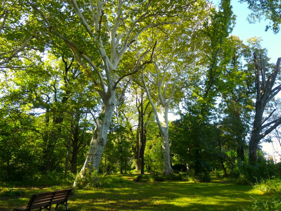 10月中旬に小石川植物園を回ってきましたが、秋の季節が少しずつ進んできました。園内の巨木、大木が立ち並ぶ巨木並木の風景です。中央部のスズカケノキ(鈴懸の木、プラタナス;スズカケノキ科スズカケノキ属)の樹木上方を見ると、うっすらと黄葉し始めているのが分かります。