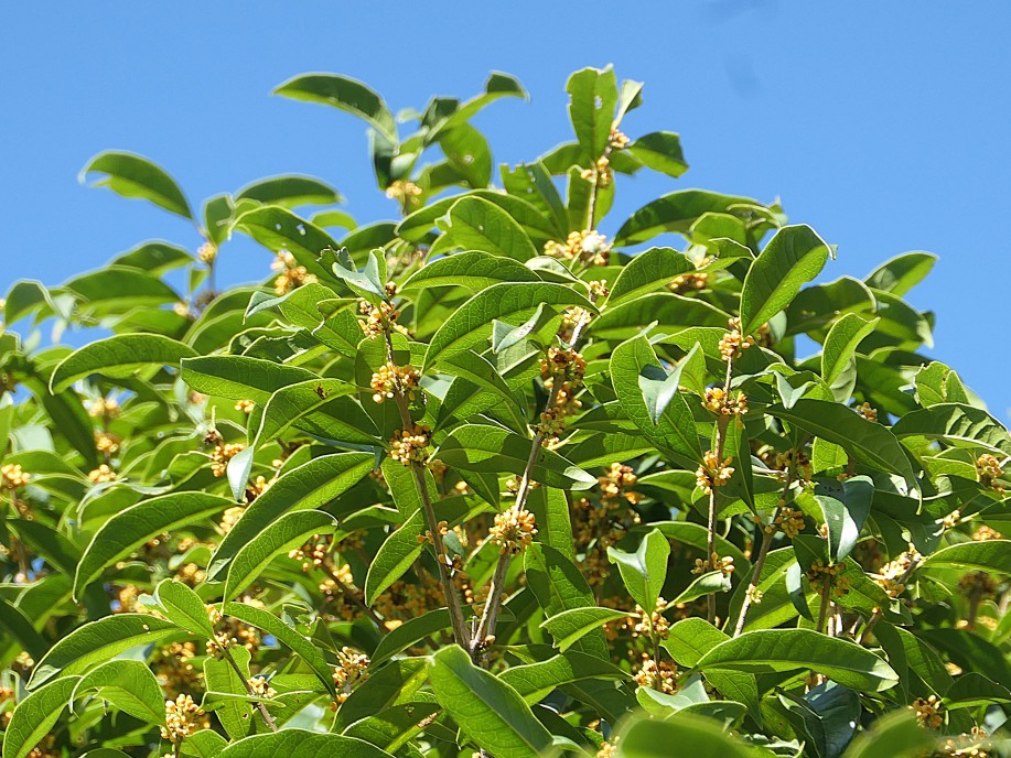 秋の代表的な芳香木のキンモクセイ(金木犀;モクセイ科モクセイ属)。キンモクセイのいい香りは季節の風物詩で、この芳香を楽しみにし植物園に出かけたのですが、約1週間前に満開だったそうで、残念ながらこの日は花はほとんど終わり。今年はかすかな残り香で我慢せざるを得ませんでした。