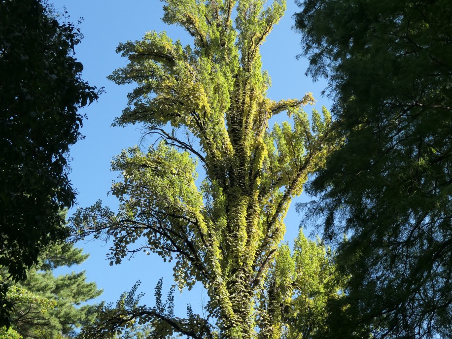 イタリアヤマナラシ(西洋箱柳、ポプラ;ヤナギ科ヤマナラシ属)の高木。かなり黄葉が進んでいるように見えますが、これは木の幹に巻き付いているナツヅタ(夏蔦;ブドウ科ツタ属)の黄葉です。一見すると間違いそうになります。