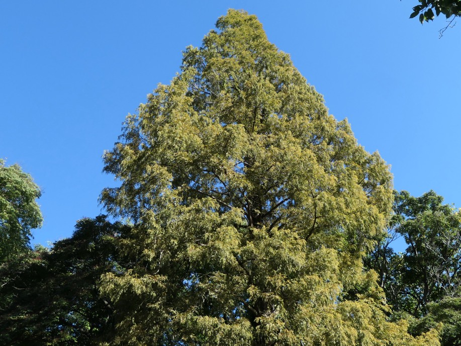 巨木並木以外にも園内各所に巨木や高木が生えています。園入口すぐ近くのメタセコイア(曙杉;ヒノキ科セコイア亜科メタセコイア属)もうっすらと黄葉が見られます。
